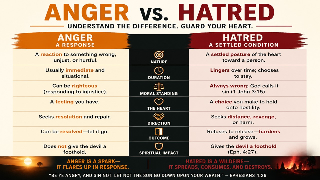 Let’s also make distinctions between anger and hatred. Anger is a response. Hatred is a settled condition. Anger flares up when something is wrong. Hatred is a settled posture of the heart toward someone. Anger is immediate and usually just situational. Hatred lingers, chooses to stick around. Anger can be righteous. Hatred is always a sin. Consider I John 3:15 – “Whosoever hateth his brother is a murderer.” Anger is a feeling. Hatred is a choice you make. Anger can be resolved. You can let anger go. Hatred lingers and changes you from the inside out. Hatred hardens your heart. Anger knocks on the door. Hatred moves in, rearranges the furniture, and starts calling all the shots.